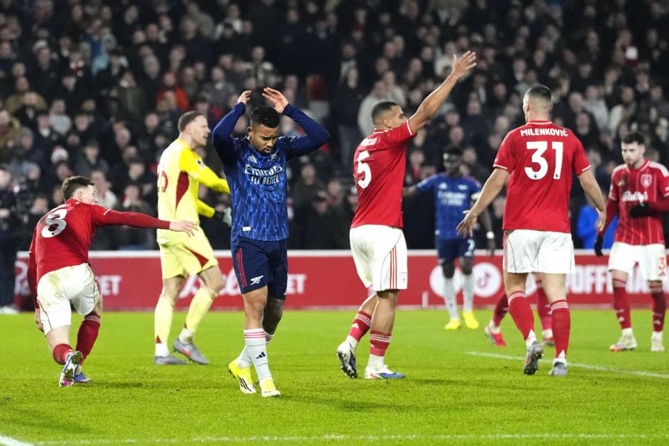 More Saka trickery on the right set up another chance as Merino’s header almost allowed Jesus to stab home, but Forest got bodies in the way.