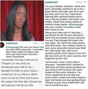 Tunji Balogun popularly known as Tee Billz who is the husband of Tiwa Savage of the Marvin Record has come out to disclose on the social media that he has parted ways with her wife. Tiwa and Tunji got married over three years ago and it seems everything looked blissful then but things got so bad when Tiwa sacked her husband who used to be her to be replaced by another manager. In his Instagram page this morning, he accused Tiwa’s mother of witch craft among many other things. We are yet to hear from Tiwa Savage on this issue. See messages below: