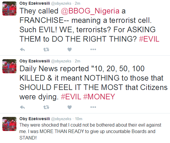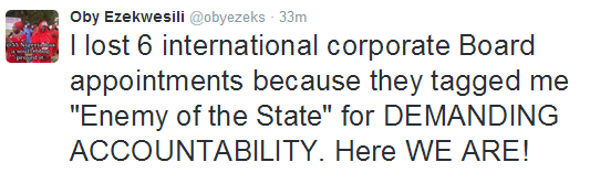 National NewsNews I lost 6 International Board Appointments – Oby Ezekwesili by Oluwaseun December 11, 2015 written by Oluwaseun December 11, 2015 Bookmark 524 The former Minister of Education, Oby Ezekwesili said she lost several important board appointment of international repute because GEJ administration tagged her enemy of state Find her tweets below: 0 comments 0 FacebookTwitterPinterestEmail Oluwaseun Follow Author previous post D’banj’s producer accuses Olamide of song theft next post Was this the perfect murder? Wife killed husband then kept him wrapped in plastic in the back garden for 18 YEARS’ – and his body was only found after she died You may also like Bookmark December 15, 2025 Bookmark #15.2 BILLION ROAD CONSTRUCTION APPROVED IN EKITI December 15, 2025 Bookmark HOPE RISES AS FCCPC BEGINS EXPANDED INVESTIGATIONS INTO... December 13, 2025 Bookmark SEYI MAKINDE MOURNS BAYELSA STATE DEPUTY GOVERNOR’S DEATH December 13, 2025 Bookmark PDP WITHDRAWS PARTICIPATION IN BORNO STATE LOCAL GOVERNMENT... December 13, 2025 Bookmark HUMAN RIGHTS ARE NON-NEGOTIABLE–NONYE SOLUDO December 11, 2025 Bookmark SENATOR ADEMOLA ADELEKE EMERGES ACCORD PARTY GUBER CANDIDATE... December 11, 2025 Bookmark IED EXPLOSION INJURES FOUR IN BORNO December 10, 2025 Bookmark ADELEKE FORMALLY JOINS ACCORD PARTY December 10, 2025 Bookmark MILITARY JET CRASHES IN NIGER December 9, 2025 Leave a Comment Cancel Reply Save my name, email, and website in this browser for the next time I comment.