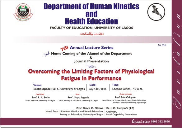 To this end, the Department of Human Kinetics and Health Education, Faculty of Education, University of Lagos Announce Her 7th Annual Lecture Series and 2nd Home coming of the Alumni.