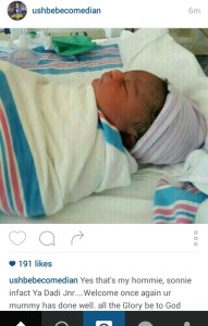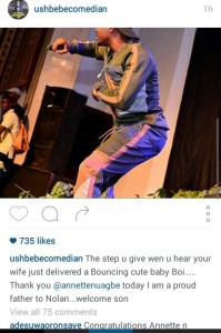 Popular Nigerian Comedian and On Air Personality, Justice Emonaerere Nuagbe popularly known as Ushbebe welcomed a bouncing baby boy on the Tuesday 15th of May, 2016 around 11pm. The Delta State born comedian whose joy knew no bound took to instagram to express his feelings and show picture of the new baby boy he named Nolan. Screenshots below: